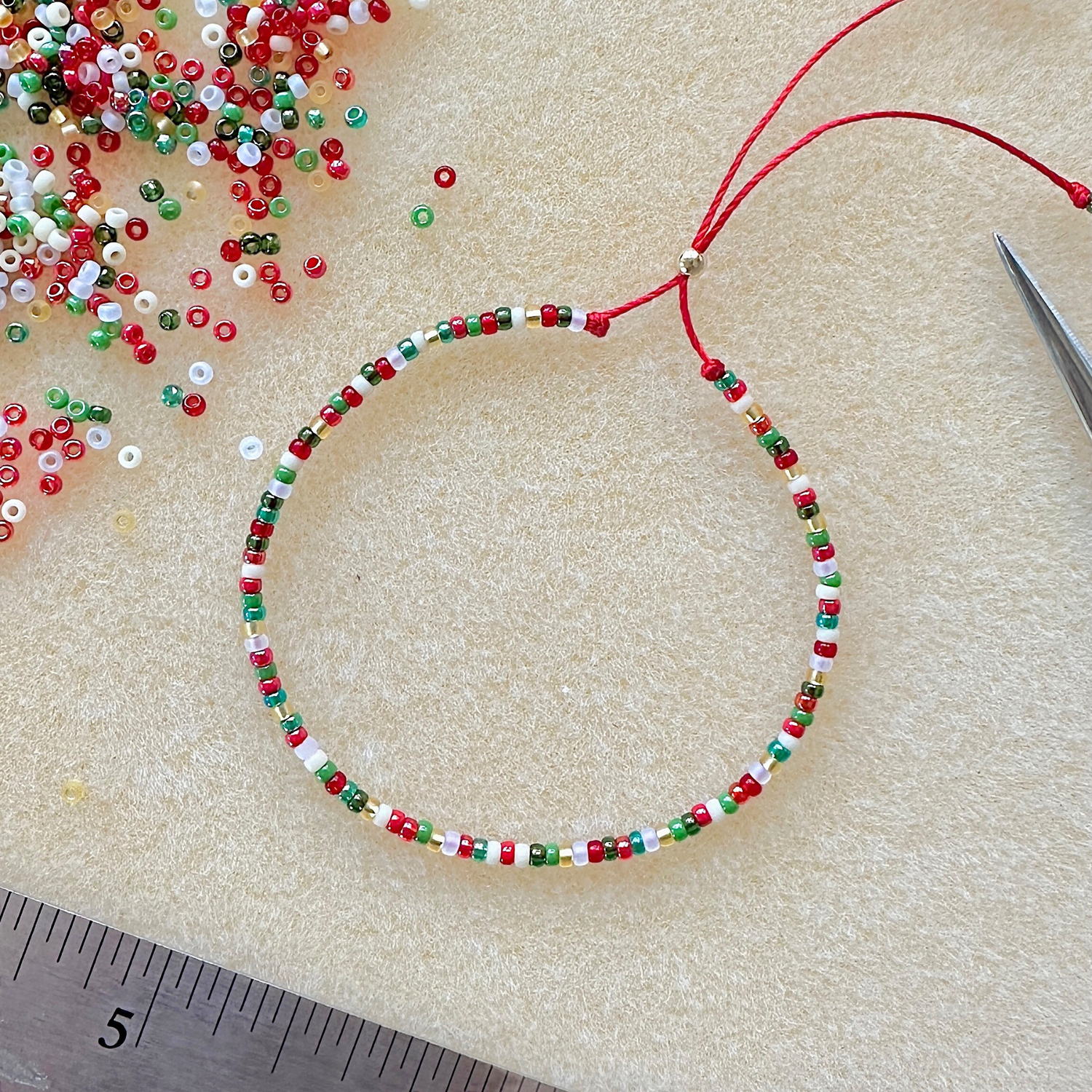 The example is made with Miyuki 11/0 seed beads, specifically our Vintage Christmas Mix. However, you can make this with any Delica mix or rocaille bead mix.