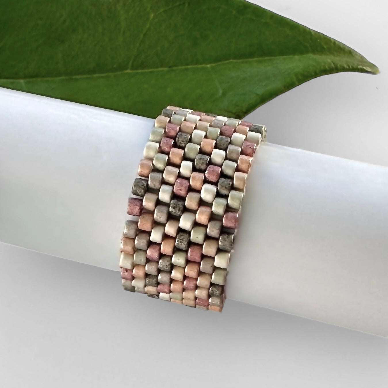 Once you get the hang of peyote stitch, one of my favorite beginner projects is even count peyote stitch rings like the one shown below. I suggest starting with one or two colors or a bead mix. It's best to get the hang of the technique before you start working with patterns. So if the tutorial you're using follows a pattern, you can ignore the pattern and focus on the technique. Below are a few YouTube tutorials for you to check out.