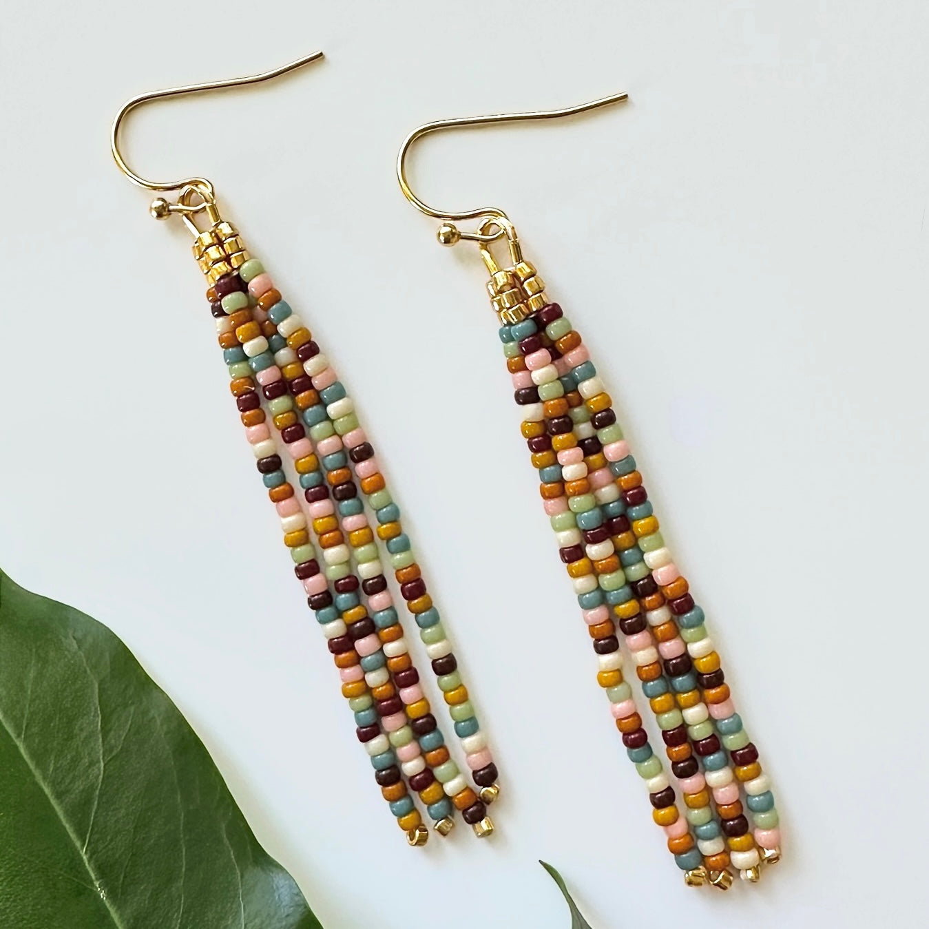 Once you get the hand of brick stitch, you may want to try adding fringe to create fringe earrings or brick stitch on a hoop. You can find beginner-friendly tutorials for these designs below.