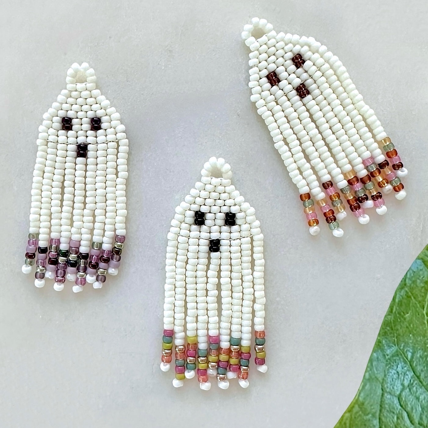 This free beading tutorial walks you through step by step how to make these cute little ghost fringe earrings with seed beads. The top portion is woven with brick stitch. It's a fun and beginner-friendly project!