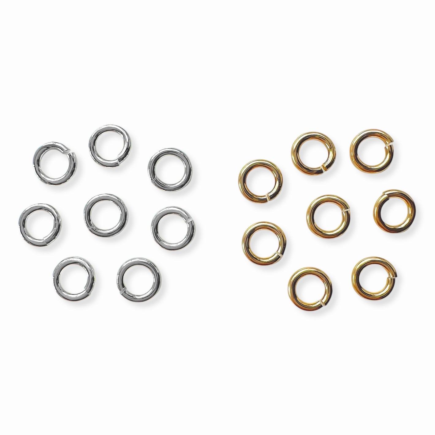Used as connectors to link different components together. 4mm. Silver and gold-plated. 10 pieces per color (20 total).