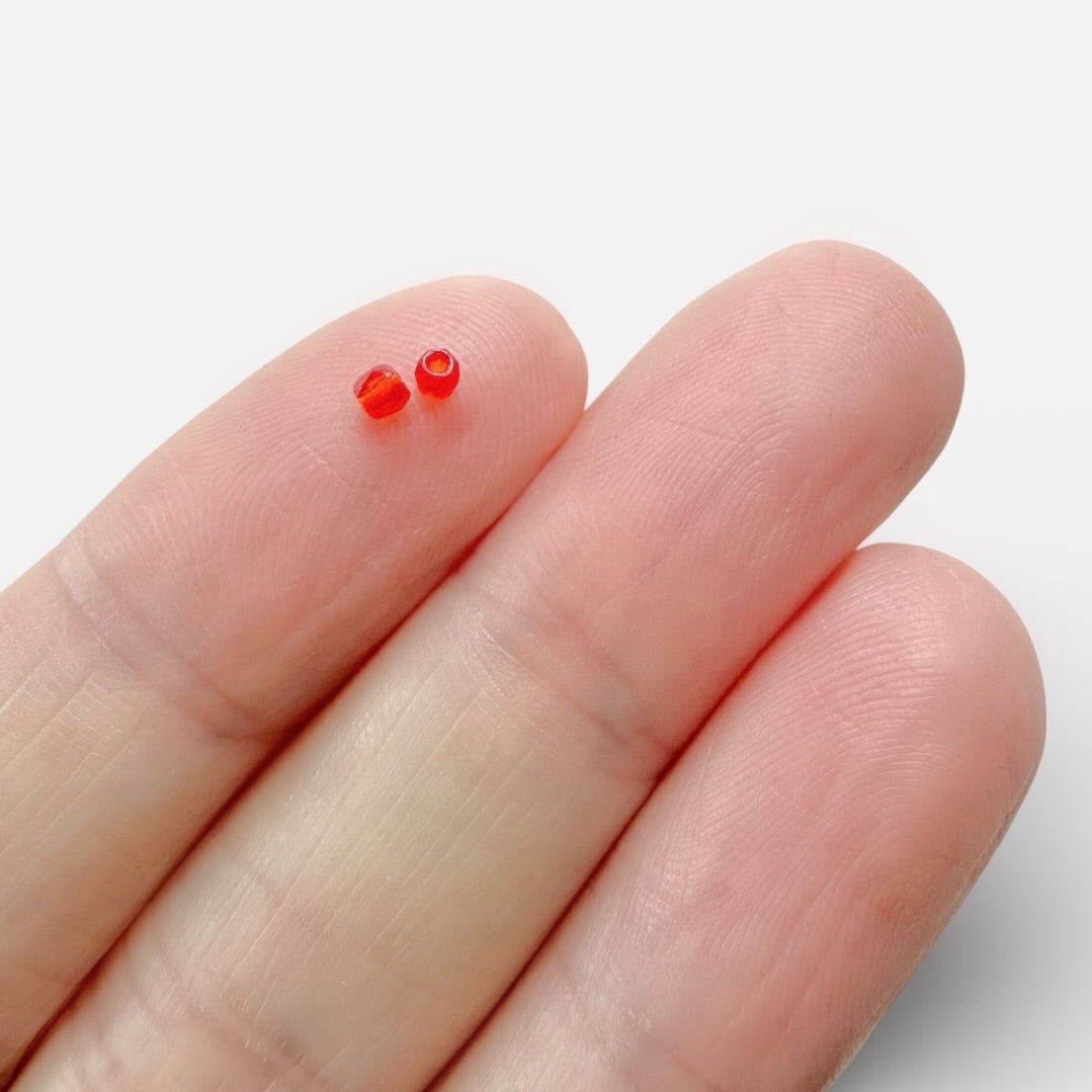 Tiny 2mm fire polished beads. They pair perfectly with 11/0 seed beads to add sparkle to your designs. This color is a bright red-orange color.