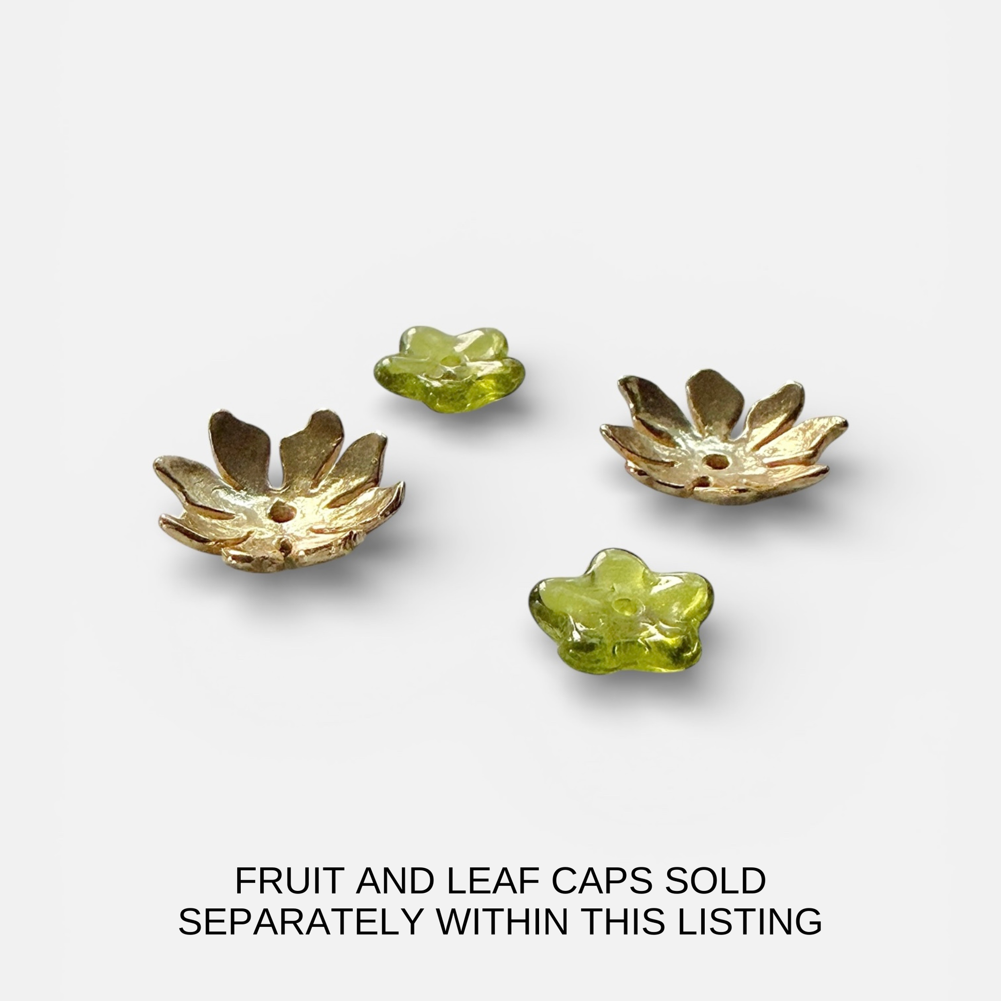 All items are sold separately within this listing (red beads, green bead caps, and metal bead caps).