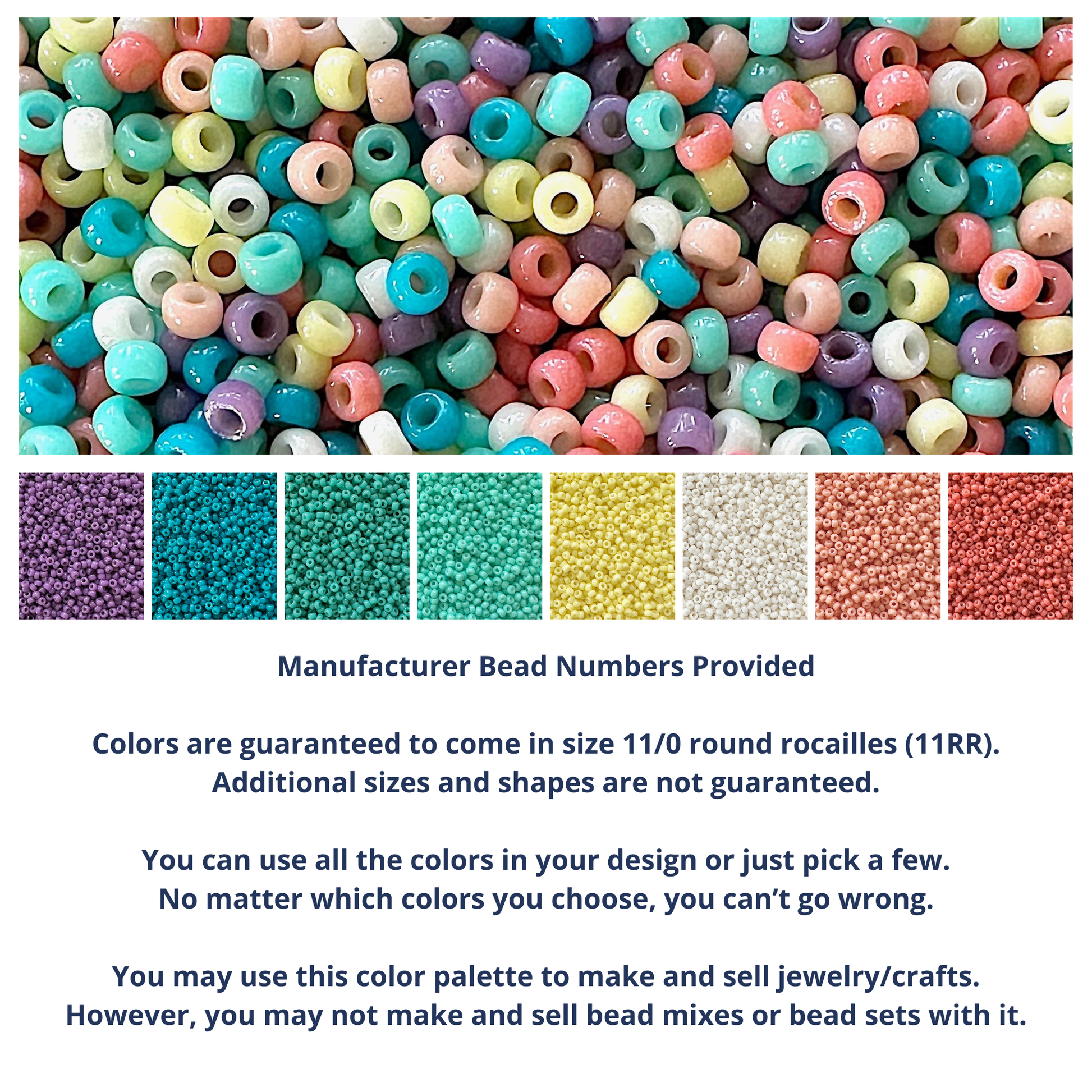 You may use this color palette to make and sell jewelry and crafts. However, you may not make and sell bead mixes or bead sets with it.